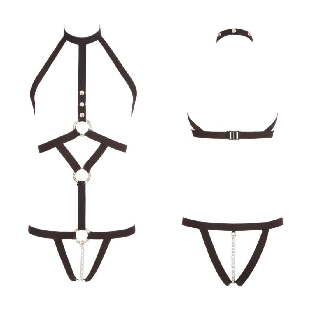 Body provocator din curele negre cu capse si inele metalice de prindere, prevazut cu lantisoare argintii in zona inghinala.