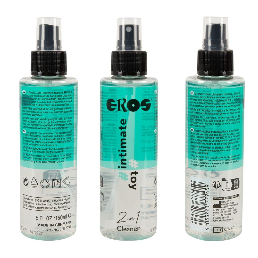 Spray de curatarea jucariilor erotice fara miros de la EROS pentru curatenie si ingrijire intr-o singura aplicare. Formula fara alcool este deosebit de blanda pentru piele si materialele jucariilor. Pur si simplu pulverizati pe partea dorita a suprafetei, lasati sa se inmoaie pentru o perioada scurta de timp si apoi stergeti.