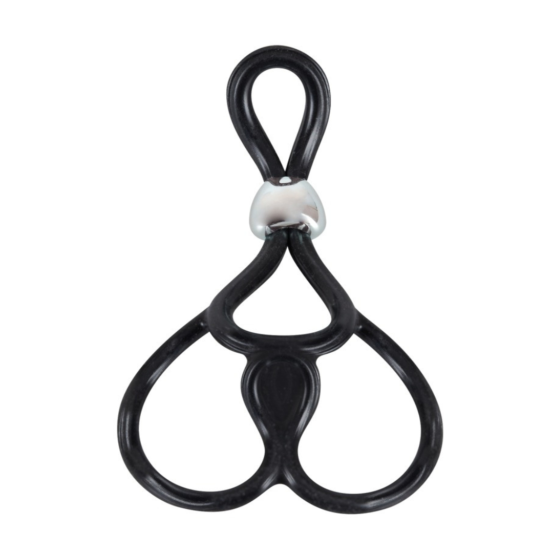 Inel pentru penis cu doua inele pentru testicule (Ø aproximativ 3 cm fiecare, elastice). Inelul pentru penis este ajustabil individual cu ajutorul margelei culisante.